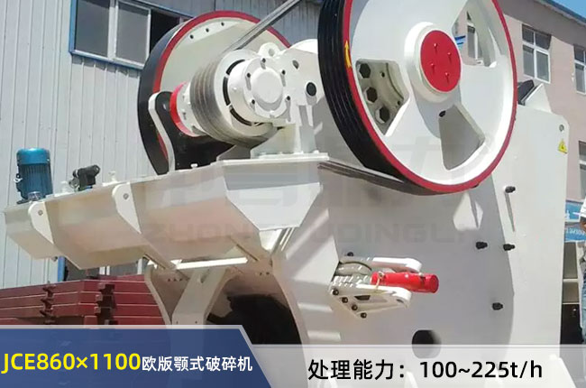 JCE860×1100歐版顎式破碎機主要用于處理大塊石料,常用于生產(chǎn)線初碎環(huán)節(jié),其進料口尺寸是860×1100mm,可允許的進料粒度為≤720mm,排料口調(diào)整范圍100-225mm,偏心軸轉(zhuǎn)速為240r/min,配備電機功率為6P 132kw,每小時生產(chǎn)能力可達200-500噸。