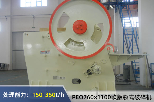 PEO760×1100歐版顎式破碎機中“760×1100”指給料口尺寸,進料粒度要求不能大于620mm,排料口調(diào)節(jié)范圍在75-200mm,一小時處理能力在150-350噸之間,偏心軸轉(zhuǎn)速是270r/min,配置的電動機功率是100-132Kw,外形尺寸是2600×2500×2200mm,機器重量在24噸左右。