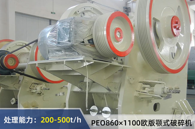 PEO860×1100歐版顎式破碎機進料口尺寸860×1100mm,進料粒度在720mm以下,配置電機功率為132-160kw,時產(chǎn)量在200-500噸,出料范圍100-225mm,重量32噸左右。